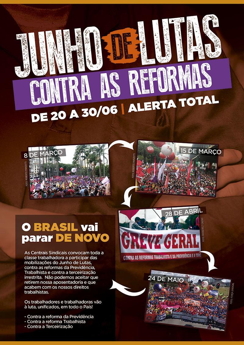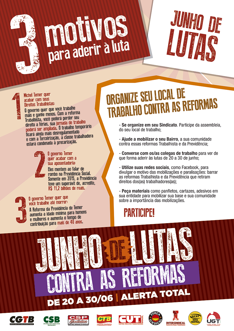 As centrais sindicais, (CUT, UGT, Força Sindical, CTB, Nova Central, CGTB, CSP-Conlutas, Intersindical, CSB e A Pública- Central do Servidor), convocam todas as suas bases para o calendário de luta e indicam uma nova GREVE GERAL dia 30 de junho.