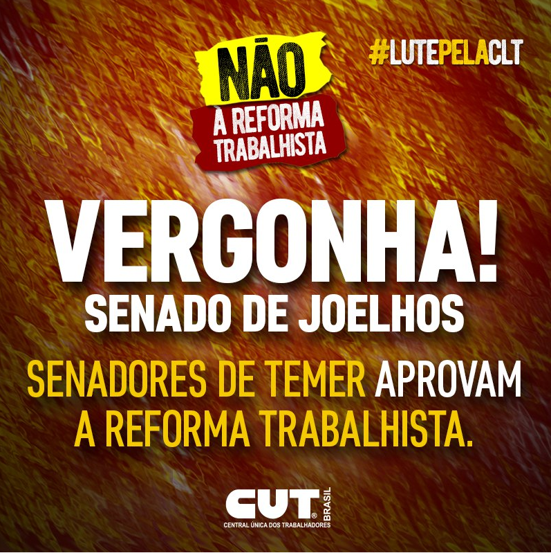 O plenário do Senado aprovou o projeto de lei (PLC 38) de "reforma" da legislação trabalhista. Foram 50 votos a favor e 26 contrários, com uma abstenção. A votação foi concluída por volta das 19h50, depois de mais de seis horas de sessão suspensa, devido a uma ocupação realizada por um grupo de senadoras da oposição. Conforme queria o governo, o texto foi aprovado sem mudanças.